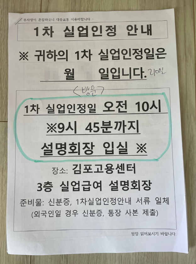 김포고용복지플러스센터에서 받아온 서류 뒷장